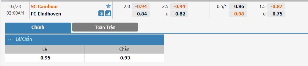 Tỷ lệ kèo cá cược bóng đá trận Cambuur vs FC Eindhoven