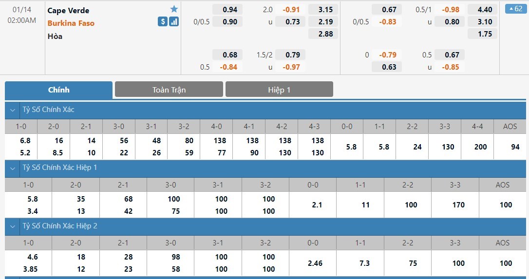 Tỷ lệ kèo cá cược bóng đá trận Cape Verde vs Burkina Faso