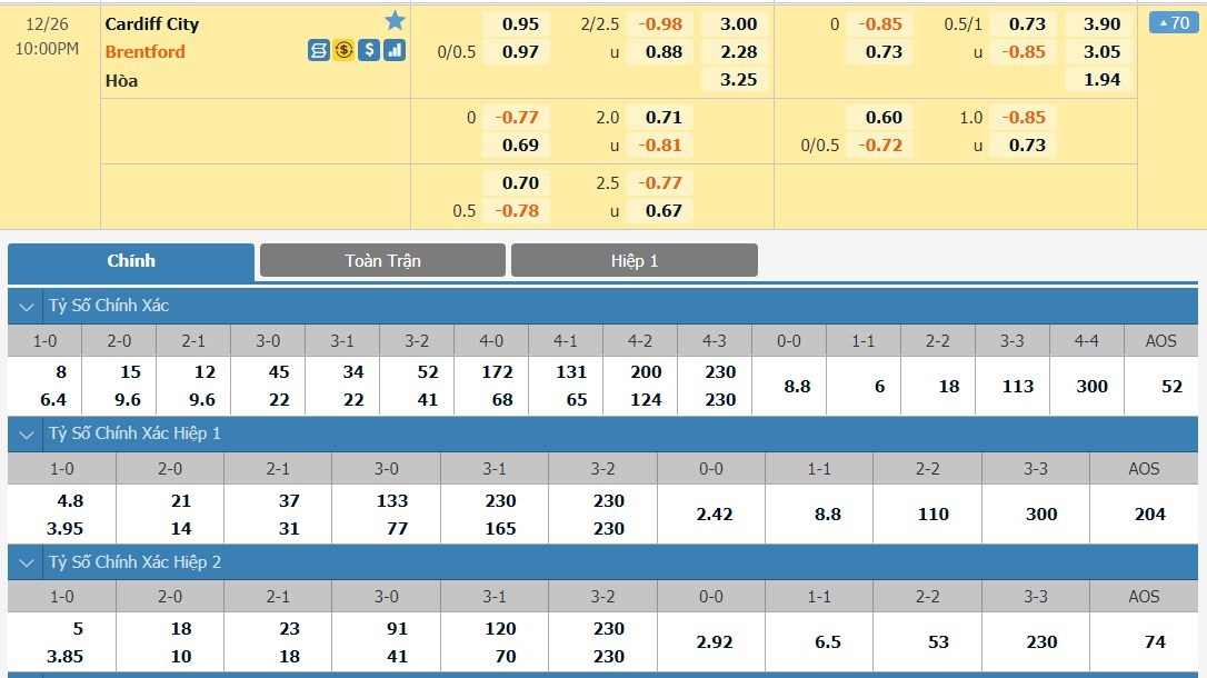 Xem tỷ lệ kèo cá cược bóng đá trực tuyến Cardiff vs Brentford