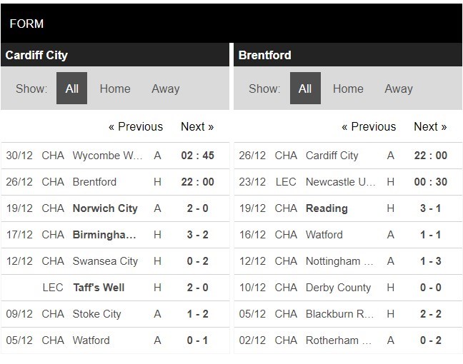 Thống kê phong độ Cardiff vs Brentford