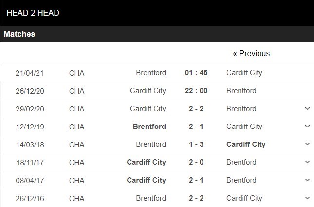 Thống kê đối đầu Cardiff vs Brentford