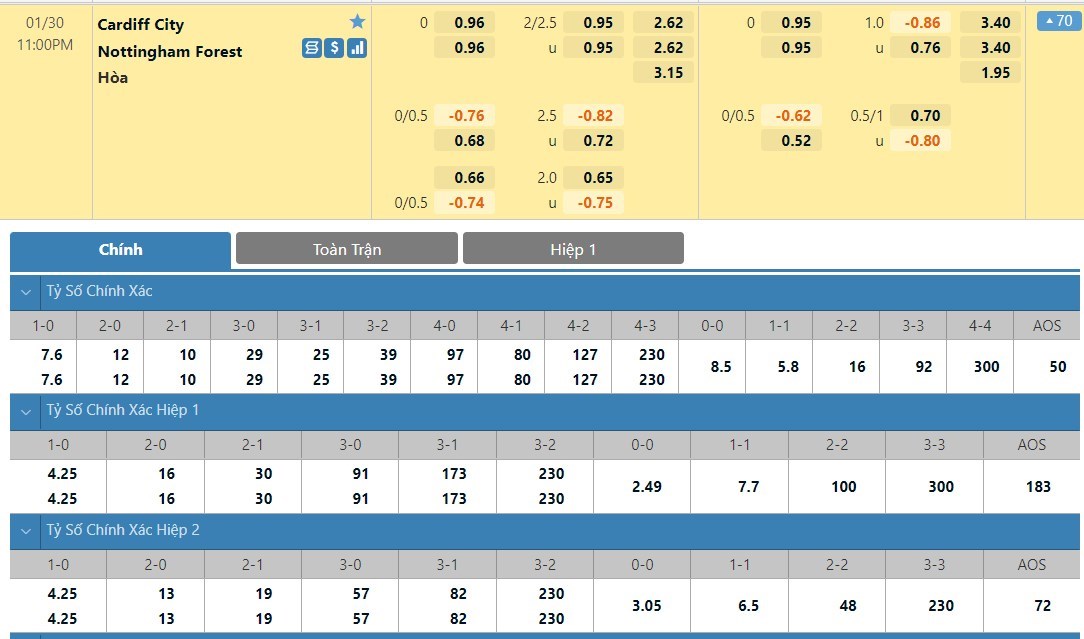 Tỷ lệ kèo cá cược bóng đá trực tuyến trận Cardiff vs Nottingham Forest