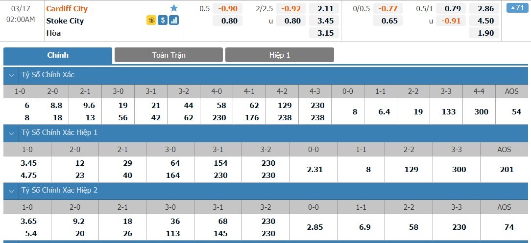 Tỷ lệ kèo cá cược bóng đá trận Cardiff vs Stoke