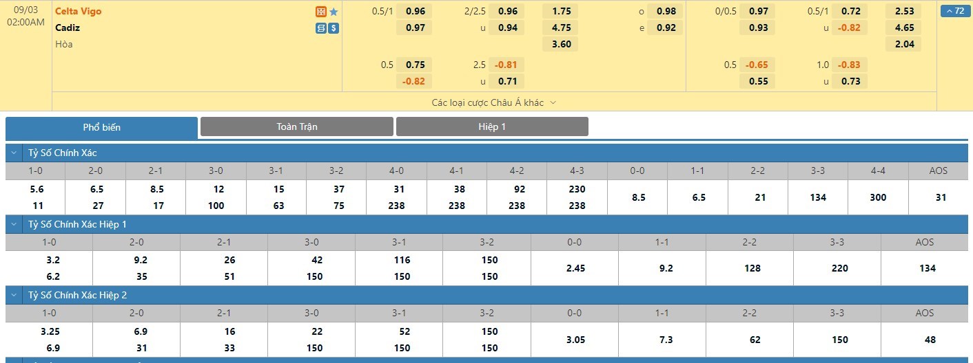 Tỷ lệ kèo cá cược bóng đá trận Celta Vigo vs Cadiz