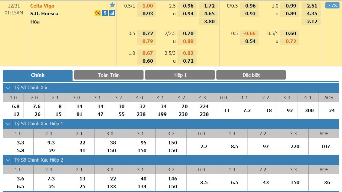 Tỷ lệ kèo cá cược bóng đá trực tuyến trận Celta Vigo vs Huesca