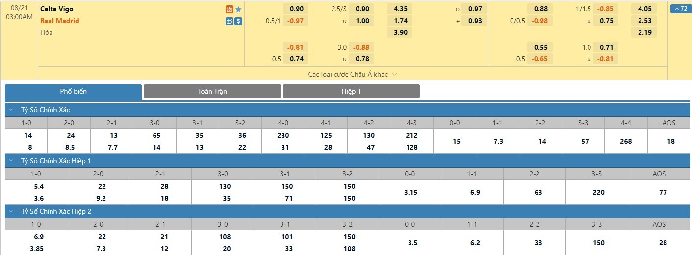 Tỷ lệ kèo cá cược bóng đá trực tuyến trận Celta Vigo vs Real Madrid