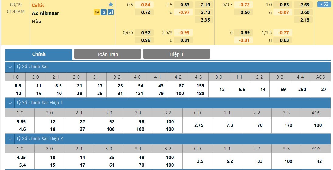 Tỷ lệ kèo cá cược bóng đá trực tuyến trận Celtic vs AZ Alkmaar