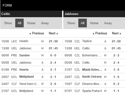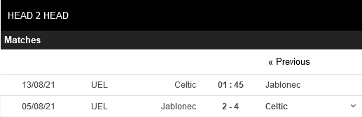 Thống kê đối đầu Celtic vs Jablonec