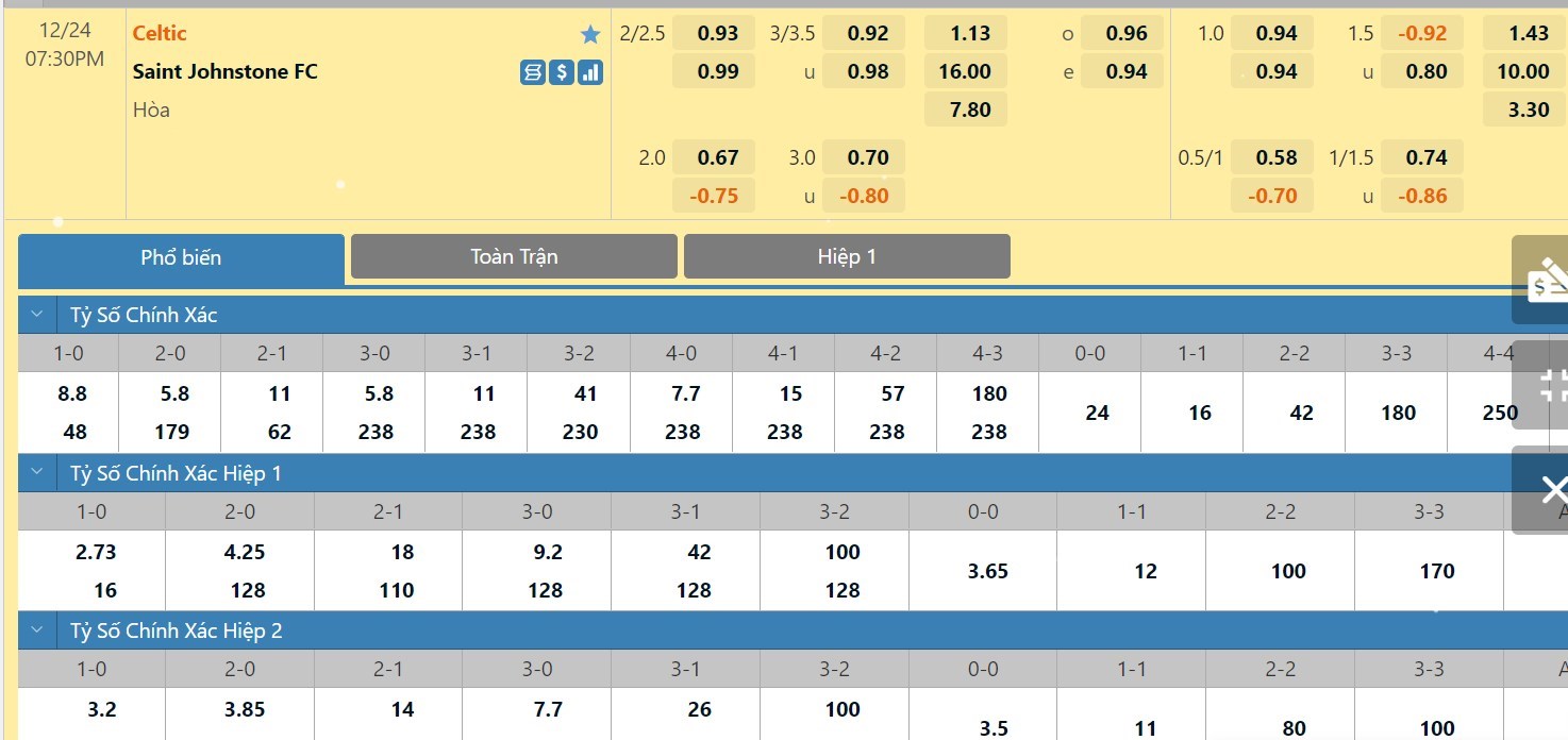 Tỷ lệ kèo cá cược bóng đá trận Celtic vs St. Johnstone