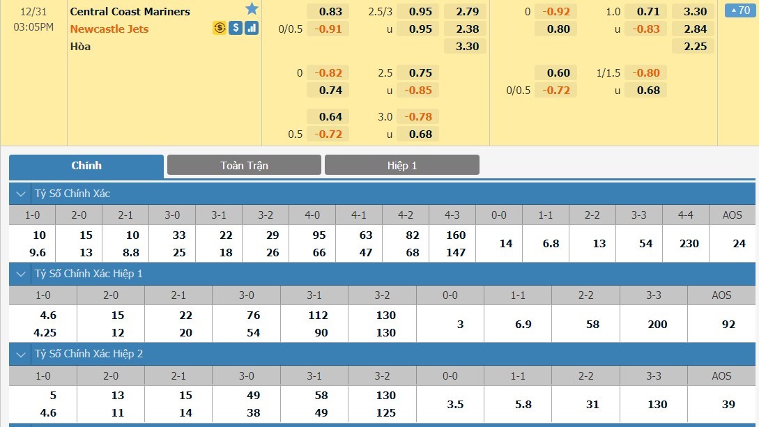 Tỷ lệ kèo cá cược bóng đá trận Central Coast Mariners vs Newcastle Jets