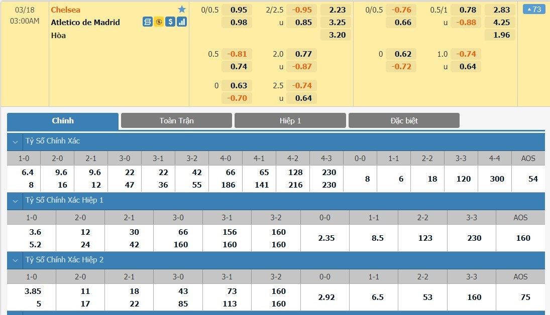 Xem tỷ lệ kèo cá cược bóng đá trực tuyến Chelsea vs Atletico Madrid