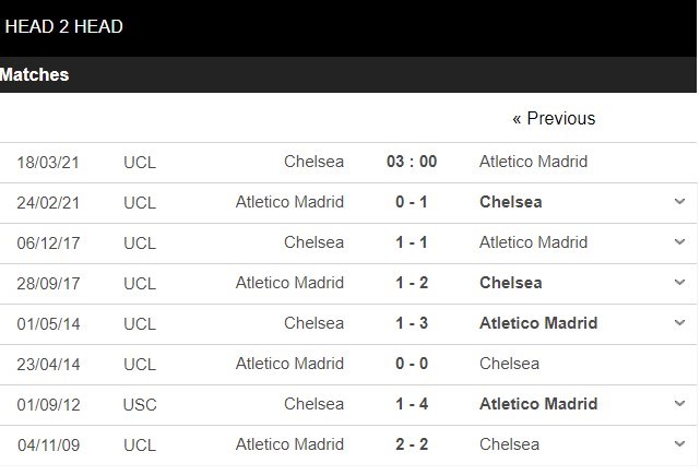 Thống kê đối đầu Chelsea vs Atletico Madrid