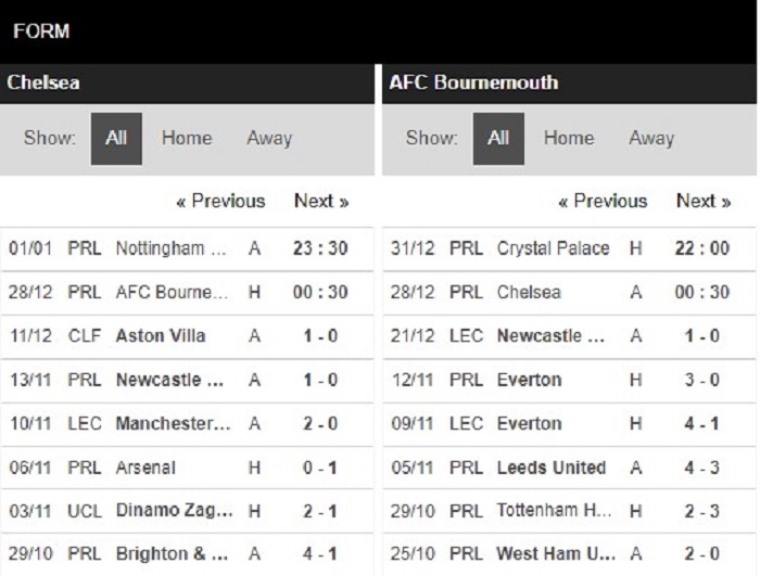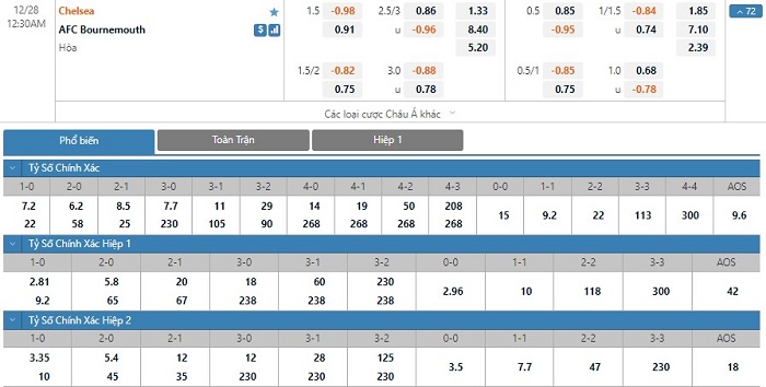 Xem tỷ lệ kèo cá cược bóng đá trực tuyến Chelsea vs Bournemouth
