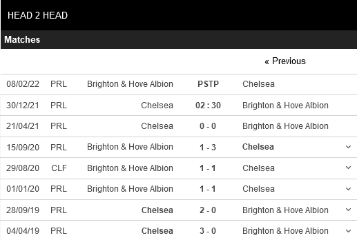 Thống kê đối đầu Chelsea vs Brighton