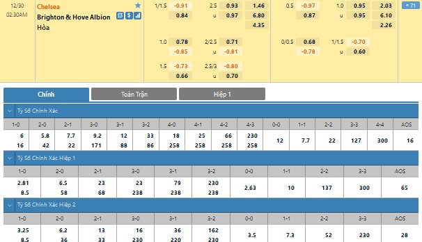 Xem tỉ lệ kèo cá cược bóng đá trực tuyến Chelsea vs Brighton
