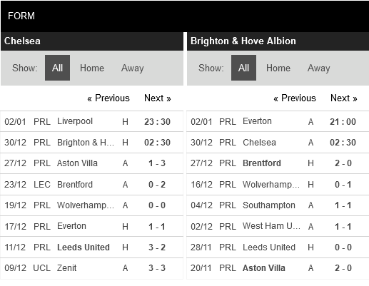 Thống kê phong độ Chelsea vs Brighton