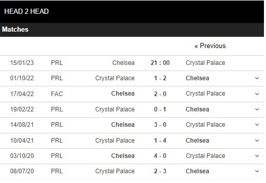 Thống kê đối đầu Chelsea vs Crystal Palace
