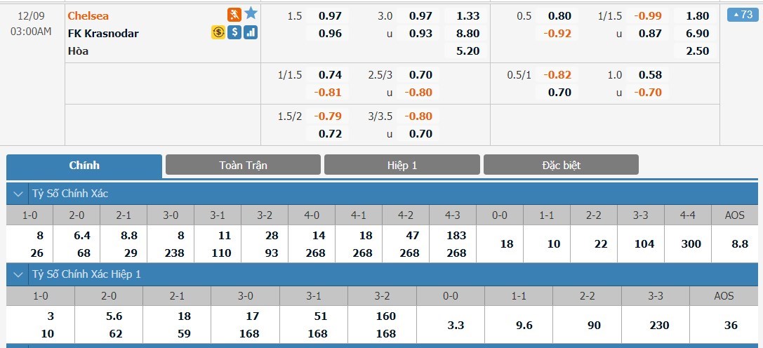 Tỷ lệ kèo cá cược bóng đá trận Chelsea vs Krasnodar