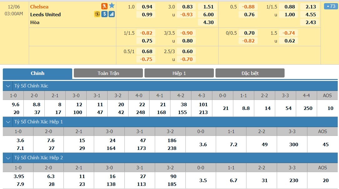 Tỷ lệ kèo cá cược bóng đá trận Chelsea vs Leeds United