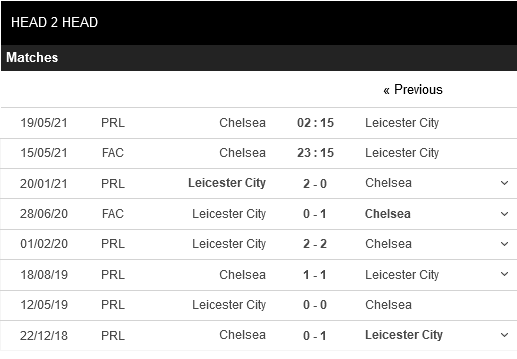 Thống kê đối đầu Chelsea vs Leicester City