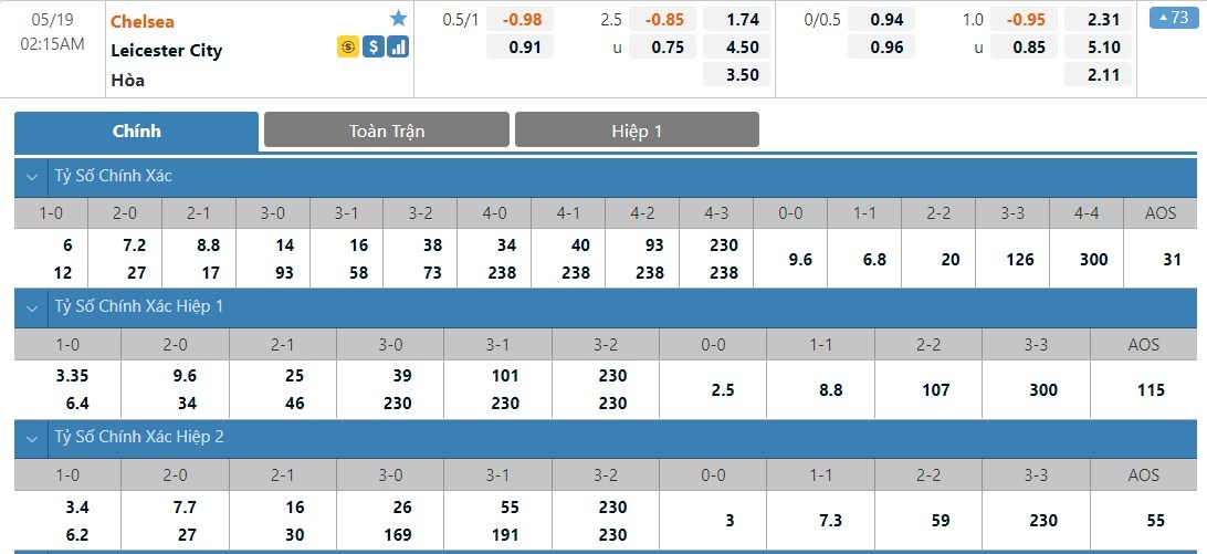 Tỷ lệ kèo cá cược bóng đá trực tuyến trận Chelsea vs Leicester City