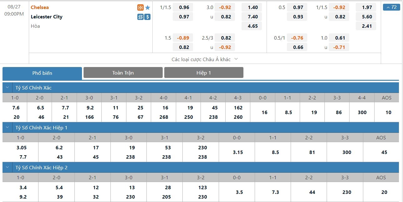 Tỷ lệ kèo cá cược bóng đá trực tuyến trận Chelsea vs Leicester