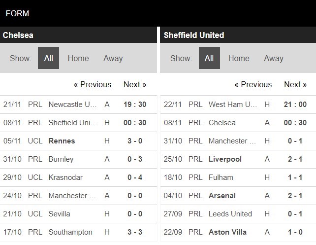 Thống kê phong độ Chelsea vs Sheffield United