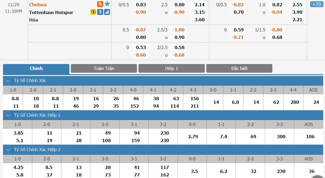 Tỷ lệ kèo cá cược bóng đá trực tuyến trận Chelsea vs Tottenham