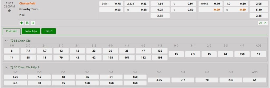 Tỷ lệ kèo cá cược bóng đá trực tuyến trận Chesterfield vs Grimsby