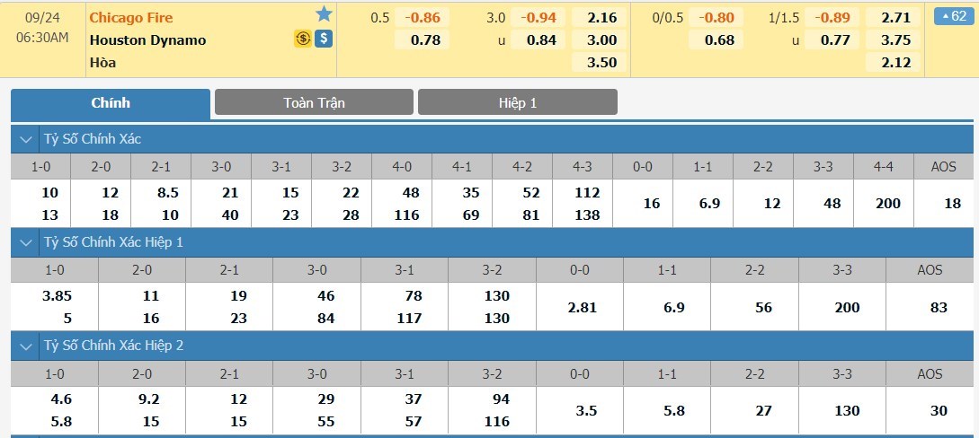 Tỷ lệ kèo cá cược bóng đá trận Chicago Fire vs Houston Dynamo