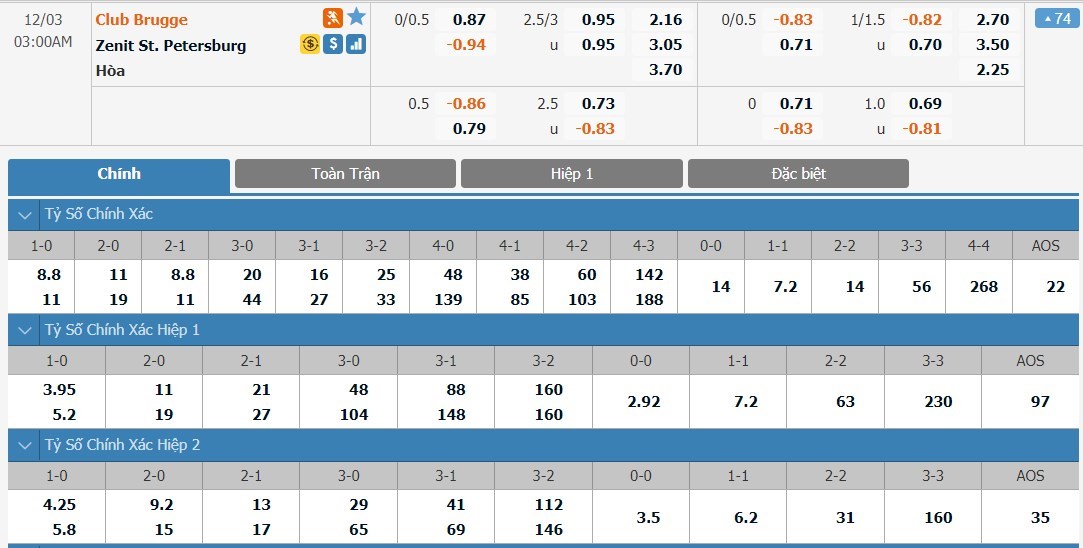 Tỷ lệ kèo cá cược bóng đá trực tuyến trận Club Brugge vs Zenit Saint Petersburg