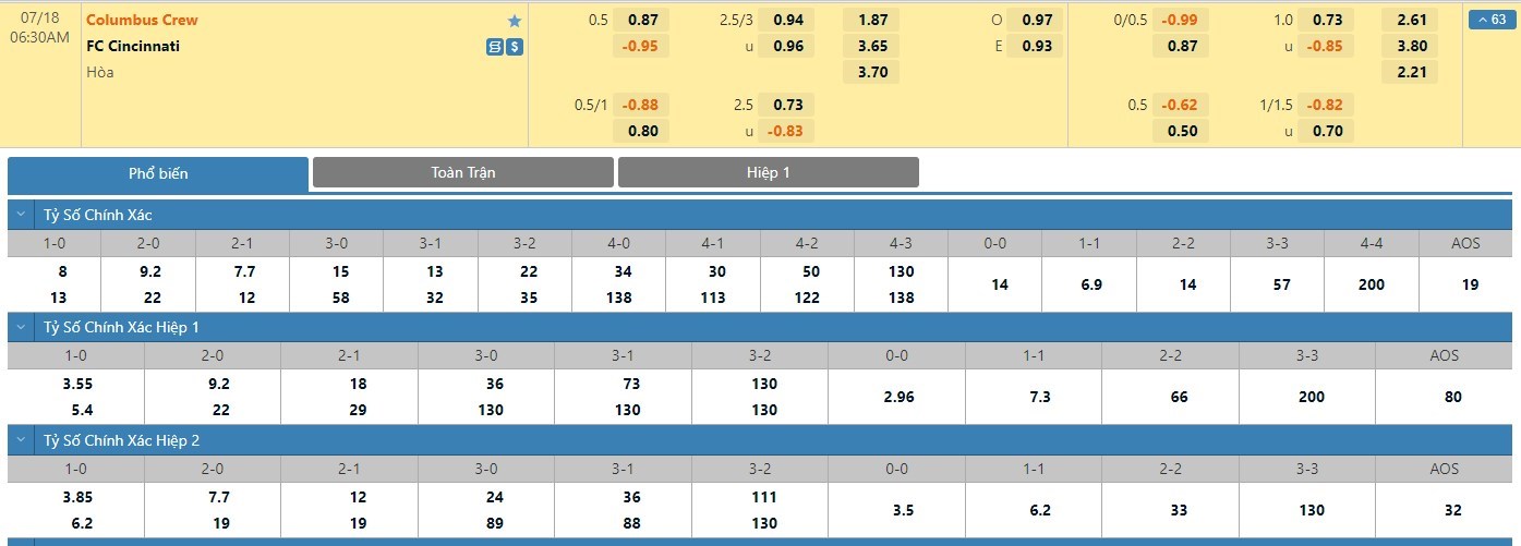 Tỷ lệ kèo cá cược bóng đá trực tuyến trận Columbus Crew vs FC Cincinnati