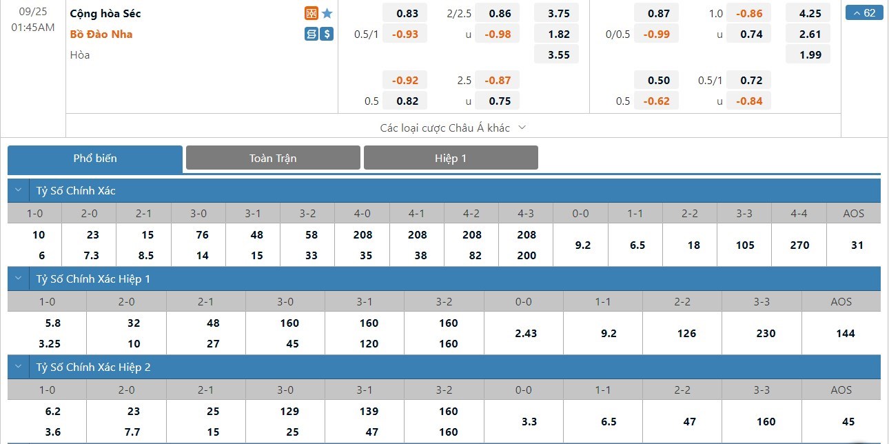 Trong 5 trận đấu gần nhất của mình, Cộng hòa Séc đã có 3 trận đấu mang về được cho mình ít nhất là 1 bàn thắng trong hiệp đấu đầu tiên. Còn với Bồ Đào Nha, đội bóng này cũng cũng đã có được 3 lần sút tung lưới đối phương trong 45 phút đầu tiên. Với tỷ lệ kèo hiệp 1 ở trận đấu này được đưa ra là Bồ Đào Nha chấp -1/4 trái, người chơi nên tin tưởng vào đội khách trận này.