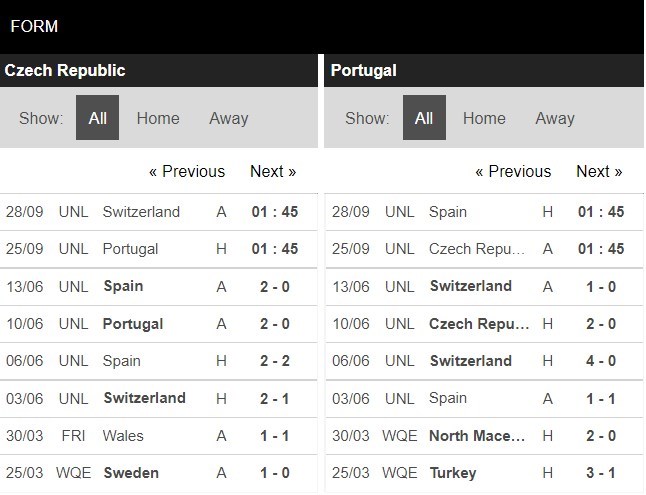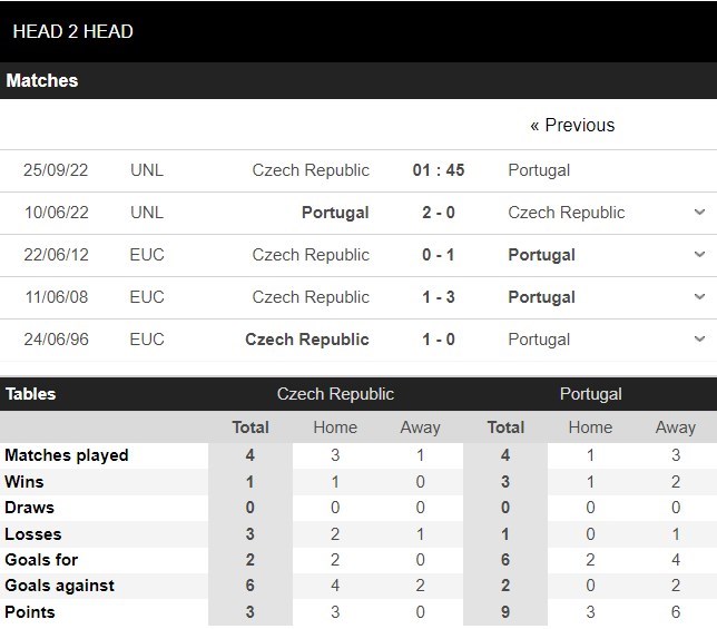 Thống kê phong độ Cộng hòa Séc vs Bồ Đào Nha