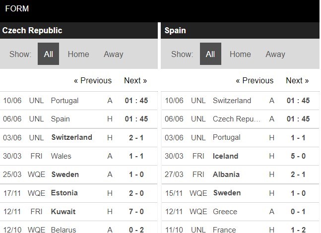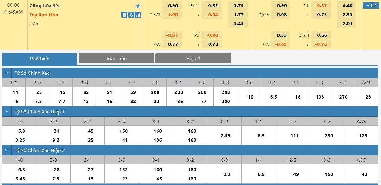 Xem tỷ lệ kèo cá cược bóng đá trực tuyến Cộng hòa Séc vs Tây Ban Nha