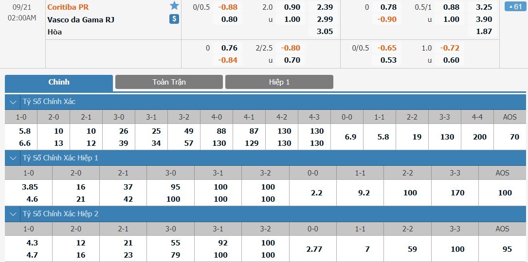 Tỷ lệ kèo cá cược bóng đá trận Coritiba vs Vasco da Gama