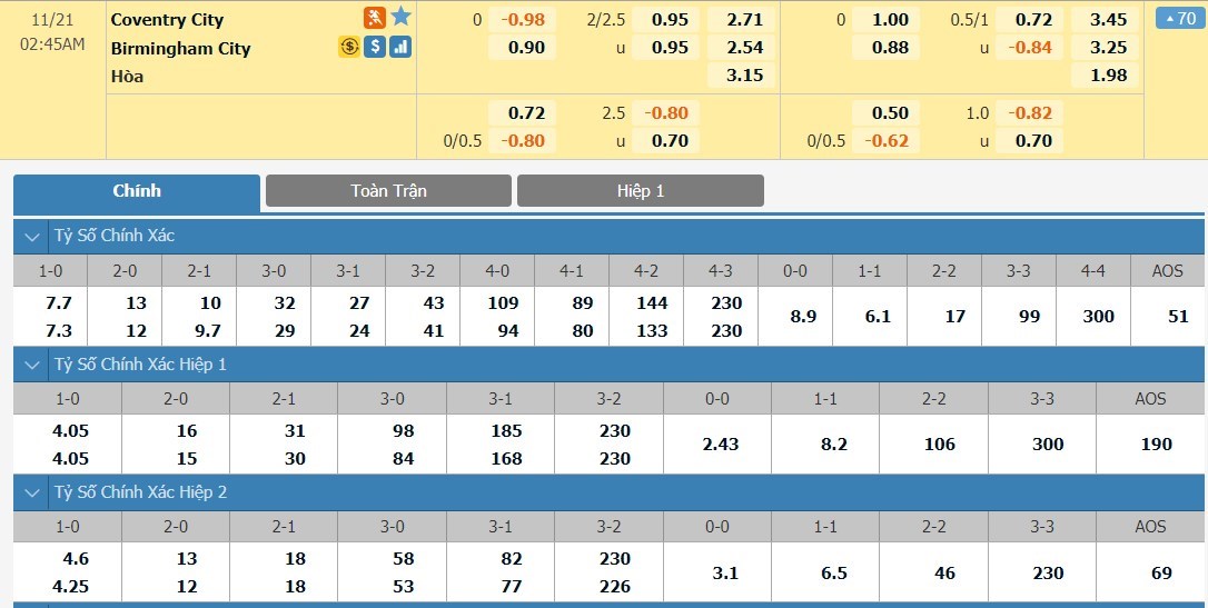 Tỷ lệ kèo cá cược bóng đá trận Coventry City vs Birmingham City