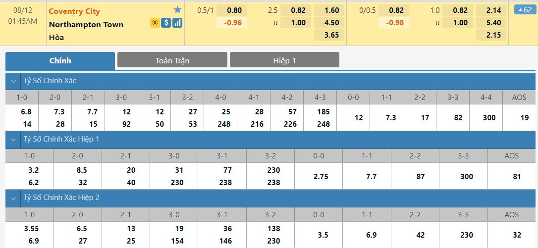 Tỷ lệ kèo cá cược bóng đá trực tuyến trận Coventry vs Northampton