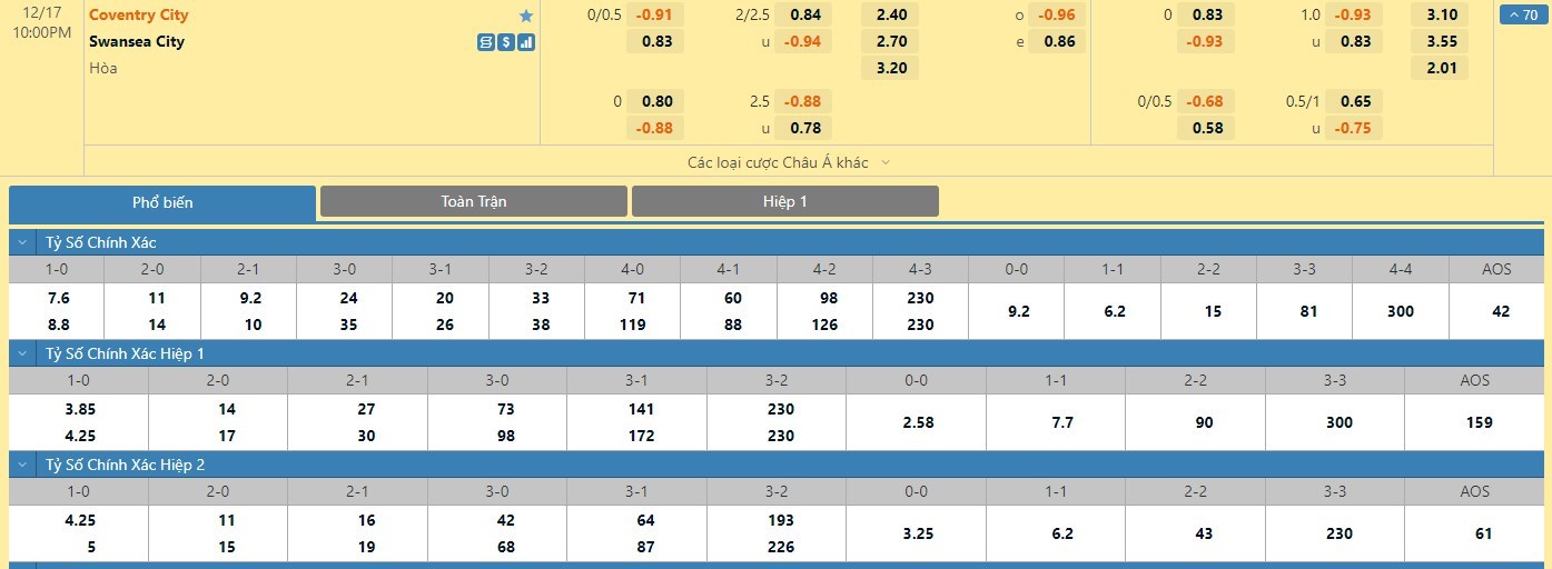 Tỷ lệ kèo cá cược bóng đá trận Coventry vs Swansea