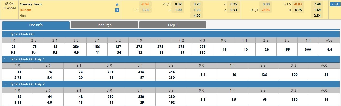 Tỷ lệ kèo cá cược bóng đá trận Crawley vs Fulham