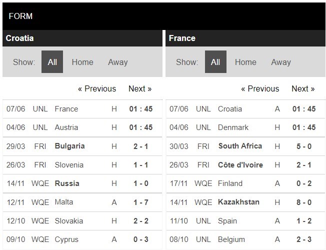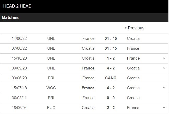 Thống kê đối đầu Croatia vs Pháp