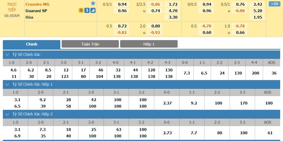 Tỷ lệ kèo cá cược bóng đá trực tuyến trận Cruzeiro vs Guarani