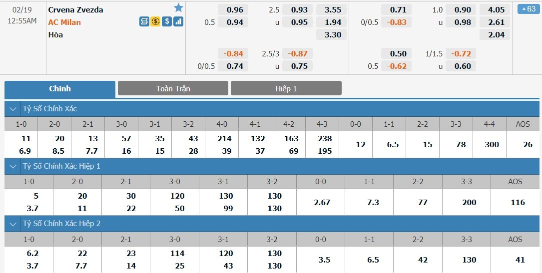 Tỷ lệ kèo cá cược bóng đá trận Crvena Zvezda vs AC Milan