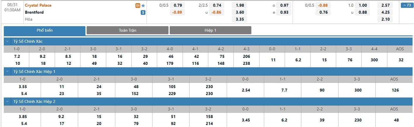 Trong 5 trận đấu gần nhất của hai đội bóng này trên mọi đấu trường, trong khi Crystal Palace mang về cho mình 3 trận đấu ghi được ít nhất 1 bàn ở hiệp 1 thì Brentford đã có 4 lần làm được điều này. Tỷ lệ kèo hiệp 1 là -1/4 trái nghiêng về Crystal Palace nhưng người chơi nên tin tưởng vào đội khách để có sự an toàn lớn hơn.