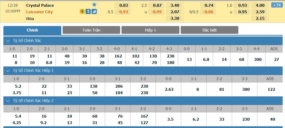 Xem tỷ lệ kèo cá cược bóng đá trực tuyến Crystal Palace vs Leicester City