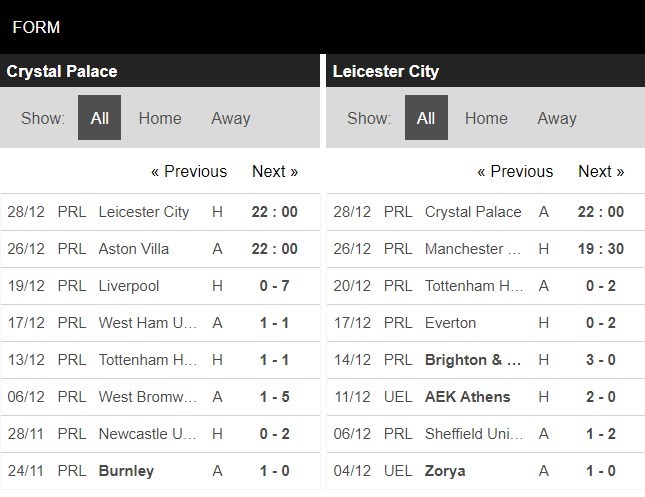 Thống kê phong độ Crystal Palace vs Leicester City