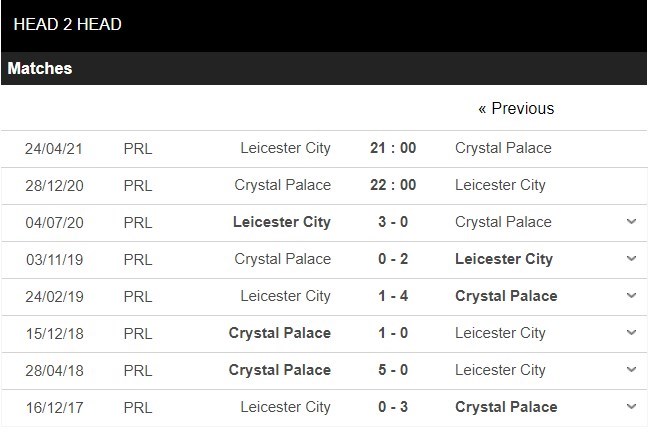 Thống kê đối đầu Crystal Palace vs Leicester City