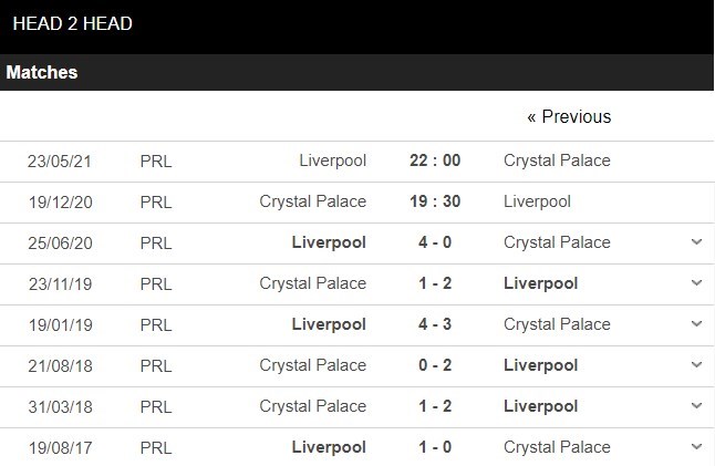 Thống kê đối đầu Crystal Palace vs Liverpool