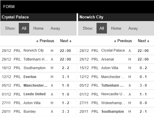Thống kê phong độ Crystal Palace vs Norwich