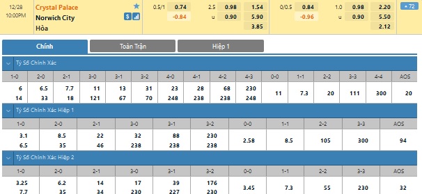 Xem tỉ lệ kèo cá cược bóng đá trực tuyến Crystal Palace vs Norwich